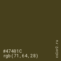 Цвет #47401C в цветовой модели RGB обозначается тремя октетами (71, 64, 28) в десятичном формате и #47401C в шестнадцатиричном (hex) формате, которые являются интенсивностью красного 71 (hex 47), интенсивность зелёного 64 (hex 40) и интенсивность синего 28 (hex 1C).