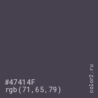 Цвет #47414F в цветовой модели RGB обозначается тремя октетами (71, 65, 79) в десятичном формате и #47414F в шестнадцатиричном (hex) формате, которые являются интенсивностью красного 71 (hex 47), интенсивность зелёного 65 (hex 41) и интенсивность синего 79 (hex 4F).