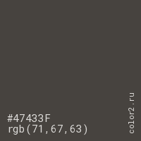 Цвет #47433F в цветовой модели RGB обозначается тремя октетами (71, 67, 63) в десятичном формате и #47433F в шестнадцатиричном (hex) формате, которые являются интенсивностью красного 71 (hex 47), интенсивность зелёного 67 (hex 43) и интенсивность синего 63 (hex 3F).