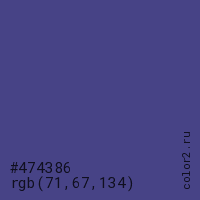 Цвет #474386 в цветовой модели RGB обозначается тремя октетами (71, 67, 134) в десятичном формате и #474386 в шестнадцатиричном (hex) формате, которые являются интенсивностью красного 71 (hex 47), интенсивность зелёного 67 (hex 43) и интенсивность синего 134 (hex 86).