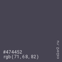 Цвет #474452 в цветовой модели RGB обозначается тремя октетами (71, 68, 82) в десятичном формате и #474452 в шестнадцатиричном (hex) формате, которые являются интенсивностью красного 71 (hex 47), интенсивность зелёного 68 (hex 44) и интенсивность синего 82 (hex 52).