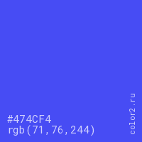 Цвет #474CF4 в цветовой модели RGB обозначается тремя октетами (71, 76, 244) в десятичном формате и #474CF4 в шестнадцатиричном (hex) формате, которые являются интенсивностью красного 71 (hex 47), интенсивность зелёного 76 (hex 4C) и интенсивность синего 244 (hex F4).