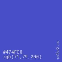 Цвет #474FC8 в цветовой модели RGB обозначается тремя октетами (71, 79, 200) в десятичном формате и #474FC8 в шестнадцатиричном (hex) формате, которые являются интенсивностью красного 71 (hex 47), интенсивность зелёного 79 (hex 4F) и интенсивность синего 200 (hex C8).