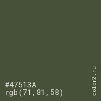 Цвет #47513A в цветовой модели RGB обозначается тремя октетами (71, 81, 58) в десятичном формате и #47513A в шестнадцатиричном (hex) формате, которые являются интенсивностью красного 71 (hex 47), интенсивность зелёного 81 (hex 51) и интенсивность синего 58 (hex 3A).