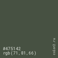 Цвет #475142 в цветовой модели RGB обозначается тремя октетами (71, 81, 66) в десятичном формате и #475142 в шестнадцатиричном (hex) формате, которые являются интенсивностью красного 71 (hex 47), интенсивность зелёного 81 (hex 51) и интенсивность синего 66 (hex 42).