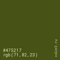 Цвет #475217 в цветовой модели RGB обозначается тремя октетами (71, 82, 23) в десятичном формате и #475217 в шестнадцатиричном (hex) формате, которые являются интенсивностью красного 71 (hex 47), интенсивность зелёного 82 (hex 52) и интенсивность синего 23 (hex 17).