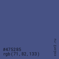 Цвет #475285 в цветовой модели RGB обозначается тремя октетами (71, 82, 133) в десятичном формате и #475285 в шестнадцатиричном (hex) формате, которые являются интенсивностью красного 71 (hex 47), интенсивность зелёного 82 (hex 52) и интенсивность синего 133 (hex 85).