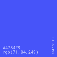Цвет #4754F9 в цветовой модели RGB обозначается тремя октетами (71, 84, 249) в десятичном формате и #4754F9 в шестнадцатиричном (hex) формате, которые являются интенсивностью красного 71 (hex 47), интенсивность зелёного 84 (hex 54) и интенсивность синего 249 (hex F9).