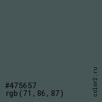 Цвет #475657 в цветовой модели RGB обозначается тремя октетами (71, 86, 87) в десятичном формате и #475657 в шестнадцатиричном (hex) формате, которые являются интенсивностью красного 71 (hex 47), интенсивность зелёного 86 (hex 56) и интенсивность синего 87 (hex 57).