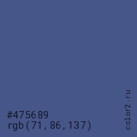 Цвет #475689 в цветовой модели RGB обозначается тремя октетами (71, 86, 137) в десятичном формате и #475689 в шестнадцатиричном (hex) формате, которые являются интенсивностью красного 71 (hex 47), интенсивность зелёного 86 (hex 56) и интенсивность синего 137 (hex 89).