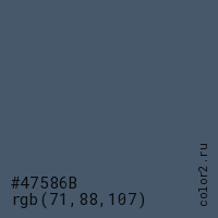 Цвет #47586B в цветовой модели RGB обозначается тремя октетами (71, 88, 107) в десятичном формате и #47586B в шестнадцатиричном (hex) формате, которые являются интенсивностью красного 71 (hex 47), интенсивность зелёного 88 (hex 58) и интенсивность синего 107 (hex 6B).