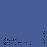 Цвет #475C94 в цветовой модели RGB обозначается тремя октетами (71, 92, 148) в десятичном формате и #475C94 в шестнадцатиричном (hex) формате, которые являются интенсивностью красного 71 (hex 47), интенсивность зелёного 92 (hex 5C) и интенсивность синего 148 (hex 94).