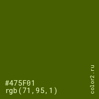 Цвет #475F01 в цветовой модели RGB обозначается тремя октетами (71, 95, 1) в десятичном формате и #475F01 в шестнадцатиричном (hex) формате, которые являются интенсивностью красного 71 (hex 47), интенсивность зелёного 95 (hex 5F) и интенсивность синего 1 (hex 01).