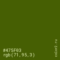 Цвет #475F03 в цветовой модели RGB обозначается тремя октетами (71, 95, 3) в десятичном формате и #475F03 в шестнадцатиричном (hex) формате, которые являются интенсивностью красного 71 (hex 47), интенсивность зелёного 95 (hex 5F) и интенсивность синего 3 (hex 03).