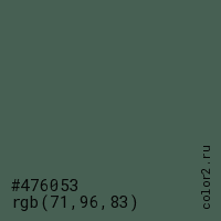 Цвет #476053 в цветовой модели RGB обозначается тремя октетами (71, 96, 83) в десятичном формате и #476053 в шестнадцатиричном (hex) формате, которые являются интенсивностью красного 71 (hex 47), интенсивность зелёного 96 (hex 60) и интенсивность синего 83 (hex 53).