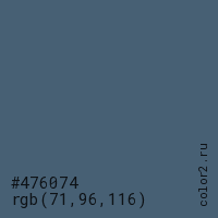 Цвет #476074 в цветовой модели RGB обозначается тремя октетами (71, 96, 116) в десятичном формате и #476074 в шестнадцатиричном (hex) формате, которые являются интенсивностью красного 71 (hex 47), интенсивность зелёного 96 (hex 60) и интенсивность синего 116 (hex 74).