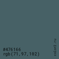 Цвет #476166 в цветовой модели RGB обозначается тремя октетами (71, 97, 102) в десятичном формате и #476166 в шестнадцатиричном (hex) формате, которые являются интенсивностью красного 71 (hex 47), интенсивность зелёного 97 (hex 61) и интенсивность синего 102 (hex 66).