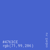 Цвет #4763CE в цветовой модели RGB обозначается тремя октетами (71, 99, 206) в десятичном формате и #4763CE в шестнадцатиричном (hex) формате, которые являются интенсивностью красного 71 (hex 47), интенсивность зелёного 99 (hex 63) и интенсивность синего 206 (hex CE).