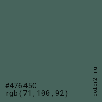 Цвет #47645C в цветовой модели RGB обозначается тремя октетами (71, 100, 92) в десятичном формате и #47645C в шестнадцатиричном (hex) формате, которые являются интенсивностью красного 71 (hex 47), интенсивность зелёного 100 (hex 64) и интенсивность синего 92 (hex 5C).