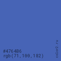 Цвет #4764B6 в цветовой модели RGB обозначается тремя октетами (71, 100, 182) в десятичном формате и #4764B6 в шестнадцатиричном (hex) формате, которые являются интенсивностью красного 71 (hex 47), интенсивность зелёного 100 (hex 64) и интенсивность синего 182 (hex B6).