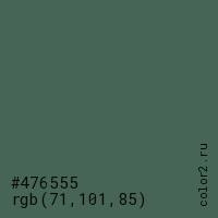 Цвет #476555 в цветовой модели RGB обозначается тремя октетами (71, 101, 85) в десятичном формате и #476555 в шестнадцатиричном (hex) формате, которые являются интенсивностью красного 71 (hex 47), интенсивность зелёного 101 (hex 65) и интенсивность синего 85 (hex 55).