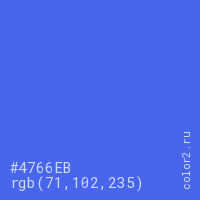 Цвет #4766EB в цветовой модели RGB обозначается тремя октетами (71, 102, 235) в десятичном формате и #4766EB в шестнадцатиричном (hex) формате, которые являются интенсивностью красного 71 (hex 47), интенсивность зелёного 102 (hex 66) и интенсивность синего 235 (hex EB).