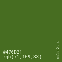 Цвет #476D21 в цветовой модели RGB обозначается тремя октетами (71, 109, 33) в десятичном формате и #476D21 в шестнадцатиричном (hex) формате, которые являются интенсивностью красного 71 (hex 47), интенсивность зелёного 109 (hex 6D) и интенсивность синего 33 (hex 21).