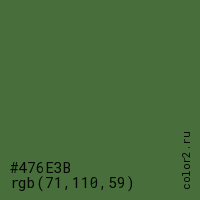 Цвет #476E3B в цветовой модели RGB обозначается тремя октетами (71, 110, 59) в десятичном формате и #476E3B в шестнадцатиричном (hex) формате, которые являются интенсивностью красного 71 (hex 47), интенсивность зелёного 110 (hex 6E) и интенсивность синего 59 (hex 3B).