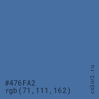 Цвет #476FA2 в цветовой модели RGB обозначается тремя октетами (71, 111, 162) в десятичном формате и #476FA2 в шестнадцатиричном (hex) формате, которые являются интенсивностью красного 71 (hex 47), интенсивность зелёного 111 (hex 6F) и интенсивность синего 162 (hex A2).