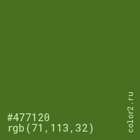 Цвет #477120 в цветовой модели RGB обозначается тремя октетами (71, 113, 32) в десятичном формате и #477120 в шестнадцатиричном (hex) формате, которые являются интенсивностью красного 71 (hex 47), интенсивность зелёного 113 (hex 71) и интенсивность синего 32 (hex 20).