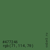 Цвет #477246 в цветовой модели RGB обозначается тремя октетами (71, 114, 70) в десятичном формате и #477246 в шестнадцатиричном (hex) формате, которые являются интенсивностью красного 71 (hex 47), интенсивность зелёного 114 (hex 72) и интенсивность синего 70 (hex 46).