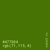Цвет #477304 в цветовой модели RGB обозначается тремя октетами (71, 115, 4) в десятичном формате и #477304 в шестнадцатиричном (hex) формате, которые являются интенсивностью красного 71 (hex 47), интенсивность зелёного 115 (hex 73) и интенсивность синего 4 (hex 04).