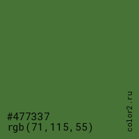 Цвет #477337 в цветовой модели RGB обозначается тремя октетами (71, 115, 55) в десятичном формате и #477337 в шестнадцатиричном (hex) формате, которые являются интенсивностью красного 71 (hex 47), интенсивность зелёного 115 (hex 73) и интенсивность синего 55 (hex 37).