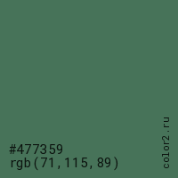 Цвет #477359 в цветовой модели RGB обозначается тремя октетами (71, 115, 89) в десятичном формате и #477359 в шестнадцатиричном (hex) формате, которые являются интенсивностью красного 71 (hex 47), интенсивность зелёного 115 (hex 73) и интенсивность синего 89 (hex 59).