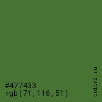 Цвет #477433 в цветовой модели RGB обозначается тремя октетами (71, 116, 51) в десятичном формате и #477433 в шестнадцатиричном (hex) формате, которые являются интенсивностью красного 71 (hex 47), интенсивность зелёного 116 (hex 74) и интенсивность синего 51 (hex 33).