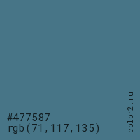 Цвет #477587 в цветовой модели RGB обозначается тремя октетами (71, 117, 135) в десятичном формате и #477587 в шестнадцатиричном (hex) формате, которые являются интенсивностью красного 71 (hex 47), интенсивность зелёного 117 (hex 75) и интенсивность синего 135 (hex 87).