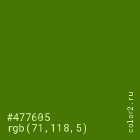 Цвет #477605 в цветовой модели RGB обозначается тремя октетами (71, 118, 5) в десятичном формате и #477605 в шестнадцатиричном (hex) формате, которые являются интенсивностью красного 71 (hex 47), интенсивность зелёного 118 (hex 76) и интенсивность синего 5 (hex 05).