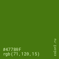 Цвет #47780F в цветовой модели RGB обозначается тремя октетами (71, 120, 15) в десятичном формате и #47780F в шестнадцатиричном (hex) формате, которые являются интенсивностью красного 71 (hex 47), интенсивность зелёного 120 (hex 78) и интенсивность синего 15 (hex 0F).