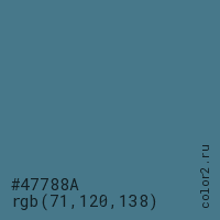 Цвет #47788A в цветовой модели RGB обозначается тремя октетами (71, 120, 138) в десятичном формате и #47788A в шестнадцатиричном (hex) формате, которые являются интенсивностью красного 71 (hex 47), интенсивность зелёного 120 (hex 78) и интенсивность синего 138 (hex 8A).