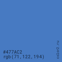 Цвет #477AC2 в цветовой модели RGB обозначается тремя октетами (71, 122, 194) в десятичном формате и #477AC2 в шестнадцатиричном (hex) формате, которые являются интенсивностью красного 71 (hex 47), интенсивность зелёного 122 (hex 7A) и интенсивность синего 194 (hex C2).