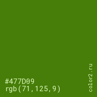 Цвет #477D09 в цветовой модели RGB обозначается тремя октетами (71, 125, 9) в десятичном формате и #477D09 в шестнадцатиричном (hex) формате, которые являются интенсивностью красного 71 (hex 47), интенсивность зелёного 125 (hex 7D) и интенсивность синего 9 (hex 09).