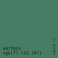 Цвет #477D65 в цветовой модели RGB обозначается тремя октетами (71, 125, 101) в десятичном формате и #477D65 в шестнадцатиричном (hex) формате, которые являются интенсивностью красного 71 (hex 47), интенсивность зелёного 125 (hex 7D) и интенсивность синего 101 (hex 65).