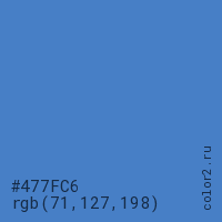 Цвет #477FC6 в цветовой модели RGB обозначается тремя октетами (71, 127, 198) в десятичном формате и #477FC6 в шестнадцатиричном (hex) формате, которые являются интенсивностью красного 71 (hex 47), интенсивность зелёного 127 (hex 7F) и интенсивность синего 198 (hex C6).