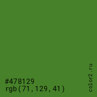 Цвет #478129 в цветовой модели RGB обозначается тремя октетами (71, 129, 41) в десятичном формате и #478129 в шестнадцатиричном (hex) формате, которые являются интенсивностью красного 71 (hex 47), интенсивность зелёного 129 (hex 81) и интенсивность синего 41 (hex 29).