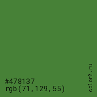 Цвет #478137 в цветовой модели RGB обозначается тремя октетами (71, 129, 55) в десятичном формате и #478137 в шестнадцатиричном (hex) формате, которые являются интенсивностью красного 71 (hex 47), интенсивность зелёного 129 (hex 81) и интенсивность синего 55 (hex 37).