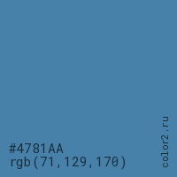 Цвет #4781AA в цветовой модели RGB обозначается тремя октетами (71, 129, 170) в десятичном формате и #4781AA в шестнадцатиричном (hex) формате, которые являются интенсивностью красного 71 (hex 47), интенсивность зелёного 129 (hex 81) и интенсивность синего 170 (hex AA).