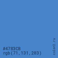 Цвет #4783CB в цветовой модели RGB обозначается тремя октетами (71, 131, 203) в десятичном формате и #4783CB в шестнадцатиричном (hex) формате, которые являются интенсивностью красного 71 (hex 47), интенсивность зелёного 131 (hex 83) и интенсивность синего 203 (hex CB).