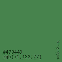 Цвет #47844D в цветовой модели RGB обозначается тремя октетами (71, 132, 77) в десятичном формате и #47844D в шестнадцатиричном (hex) формате, которые являются интенсивностью красного 71 (hex 47), интенсивность зелёного 132 (hex 84) и интенсивность синего 77 (hex 4D).