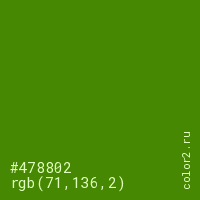 Цвет #478802 в цветовой модели RGB обозначается тремя октетами (71, 136, 2) в десятичном формате и #478802 в шестнадцатиричном (hex) формате, которые являются интенсивностью красного 71 (hex 47), интенсивность зелёного 136 (hex 88) и интенсивность синего 2 (hex 02).