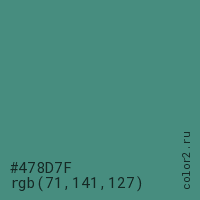 Цвет #478D7F в цветовой модели RGB обозначается тремя октетами (71, 141, 127) в десятичном формате и #478D7F в шестнадцатиричном (hex) формате, которые являются интенсивностью красного 71 (hex 47), интенсивность зелёного 141 (hex 8D) и интенсивность синего 127 (hex 7F).